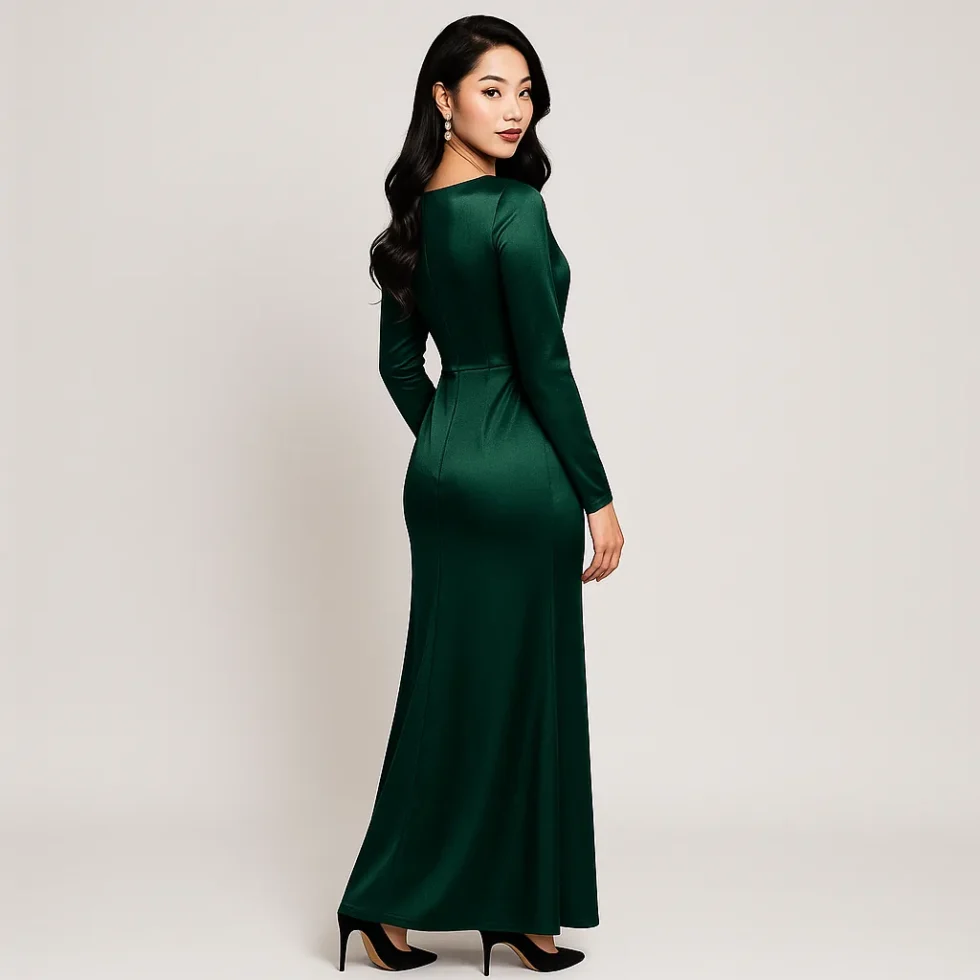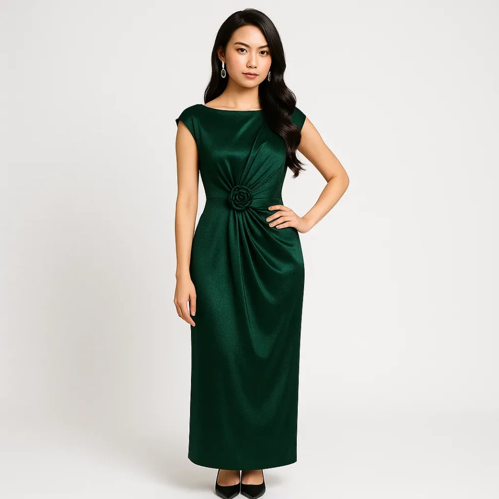 Váy dạ hội satin dài chấm đất với chi tiết hoa hồng ở eo. Một lựa chọn vượt thời gian cho đám cưới, dạ tiệc và các buổi tiệc trang trọng.