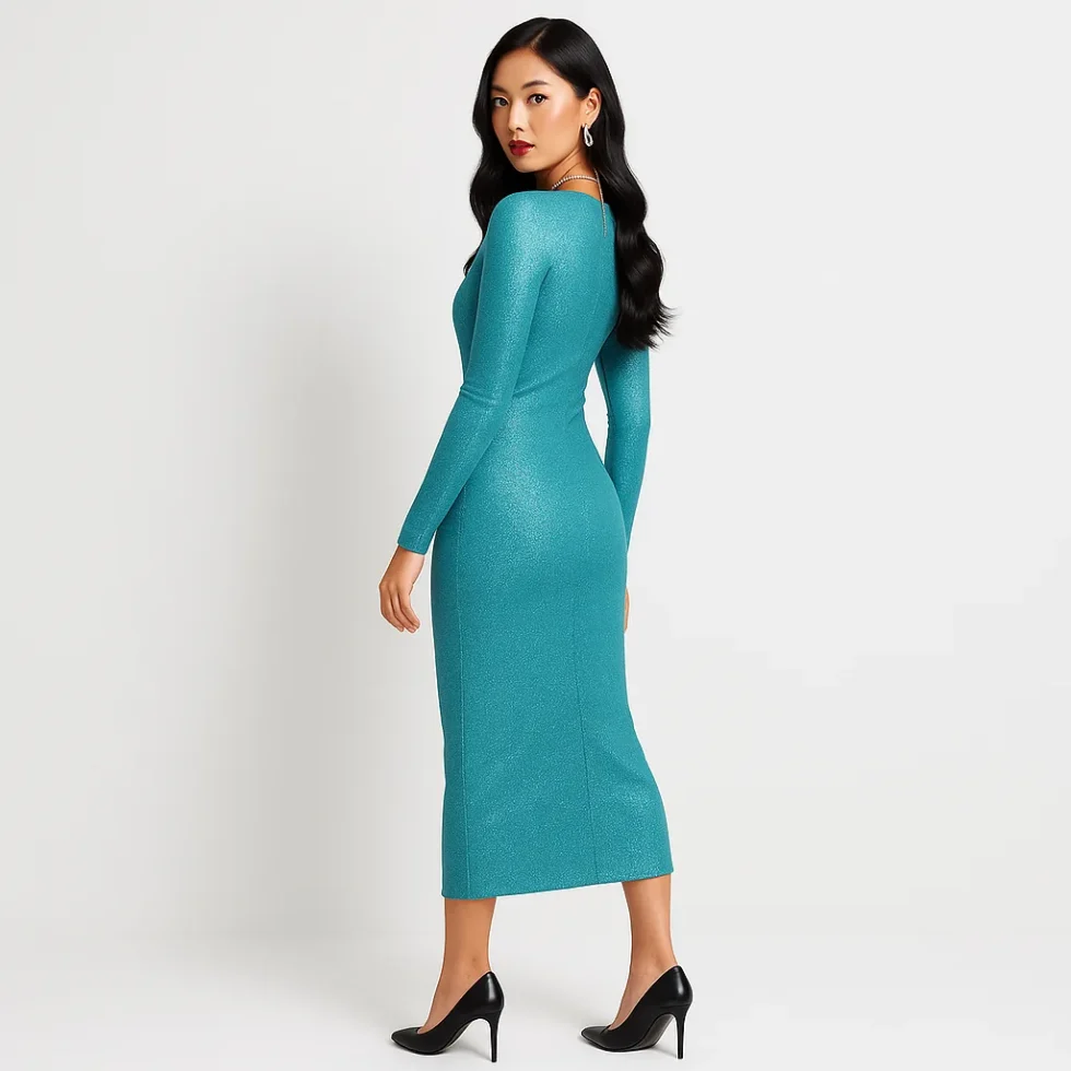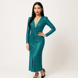 Chiếc váy cocktail lấp lánh này được thiết kế để tạo điểm nhấn cho bất kỳ sự kiện tối nào. Được may từ chất liệu vải co giãn cao cấp với lớp phủ kim tuyến, chiếc váy ôm sát cơ thể mà vẫn thoải mái vận động. Cổ chữ V khoét sâu và chi tiết nhún eo tạo nên đường cong quyến rũ, trong khi tay áo dài tôn lên vẻ tinh tế. Dễ chăm sóc và được làm bằng tay nghề thủ công tuyệt vời, chiếc váy này vừa thiết thực vừa quyến rũ—hoàn hảo cho các bữa tiệc cocktail, tiệc chiêu đãi và lễ kỷ niệm đặc biệt.