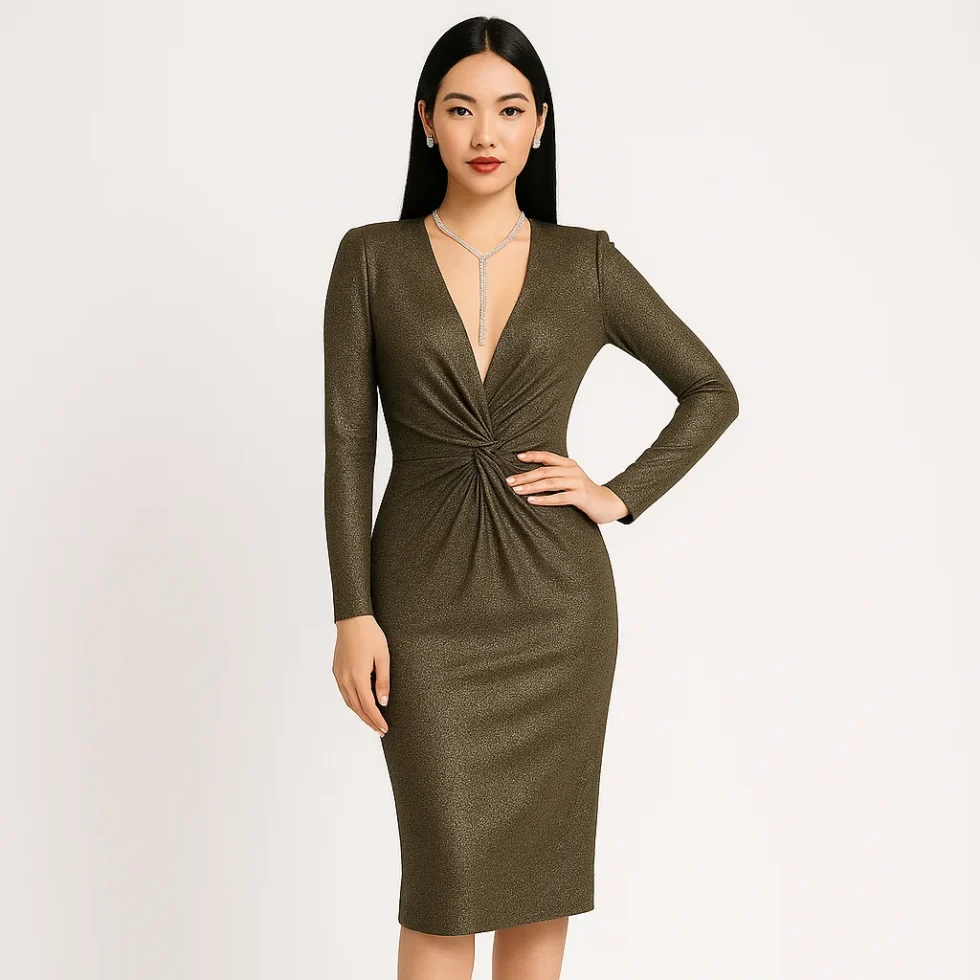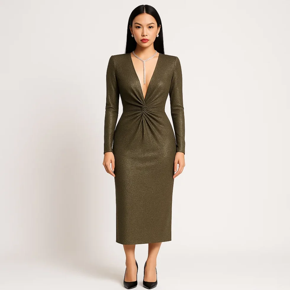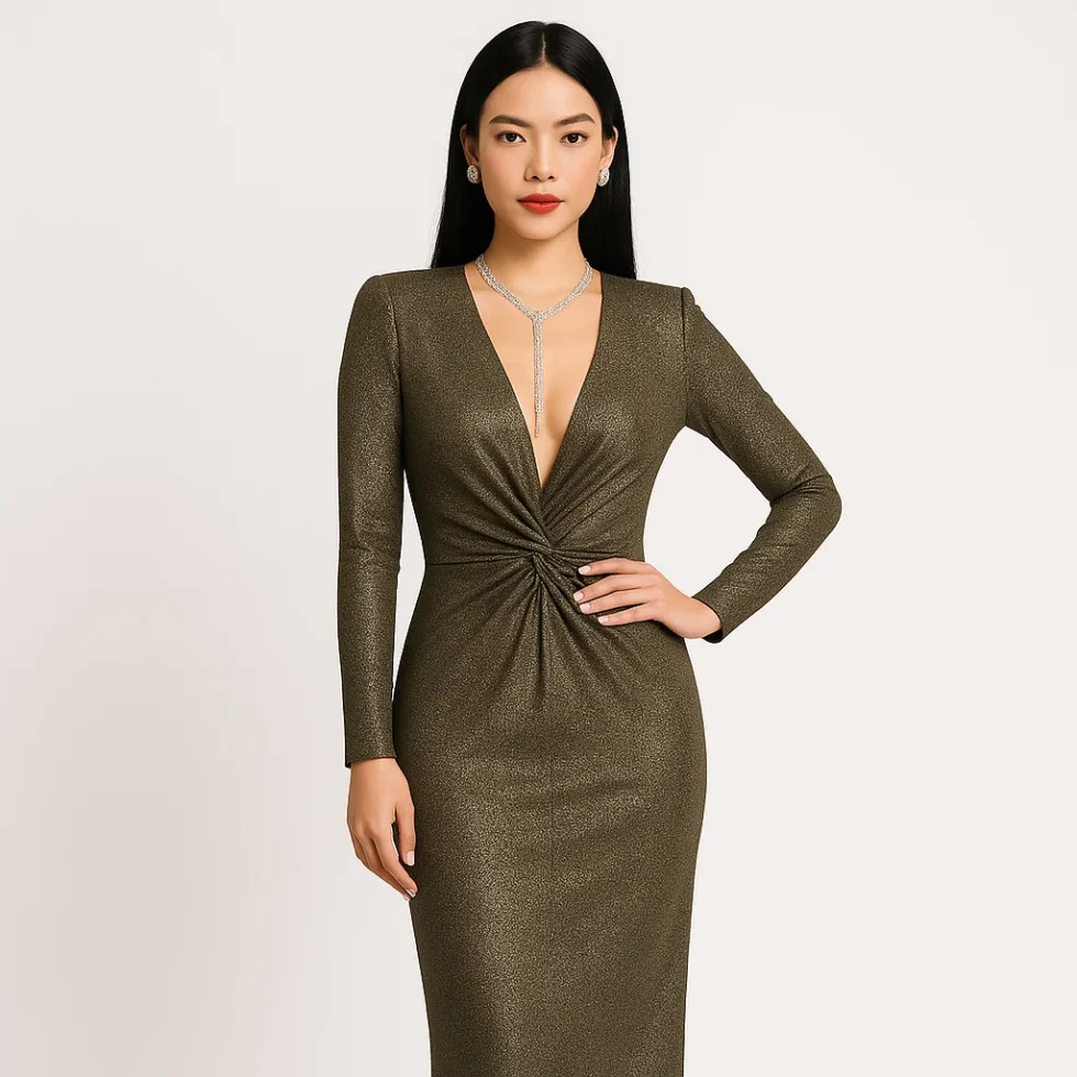 Chiếc váy cocktail lấp lánh này được thiết kế để tạo điểm nhấn cho bất kỳ sự kiện tối nào. Được may từ chất liệu vải co giãn cao cấp với lớp phủ kim tuyến, chiếc váy ôm sát cơ thể mà vẫn thoải mái vận động. Cổ chữ V khoét sâu và chi tiết nhún eo tạo nên đường cong quyến rũ, trong khi tay áo dài tôn lên vẻ tinh tế. Dễ chăm sóc và được làm bằng tay nghề thủ công tuyệt vời, chiếc váy này vừa thiết thực vừa quyến rũ—hoàn hảo cho các bữa tiệc cocktail, tiệc chiêu đãi và lễ kỷ niệm đặc biệt.