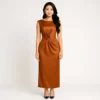 Chiếc đầm dạ hội thanh lịch này là lựa chọn vượt thời gian cho những dịp trang trọng. Được làm từ chất liệu vải satin cao cấp, chiếc đầm dài thướt tha, duyên dáng buông xuống sàn với độ rủ tinh tế. Cổ cao và dáng suông không tay mang đến vẻ ngoài cổ điển, trong khi điểm nhấn hoa hồng đặc trưng ở eo tạo thêm nét nghệ thuật. Tay nghề thủ công cao cấp đảm bảo sự thoải mái và độ bền, trong khi lớp phủ satin mang đến độ bóng tinh tế, tôn lên vẻ đẹp sang trọng. Lý tưởng cho đám cưới, dạ tiệc hoặc sự kiện trang trọng, chiếc đầm này toát lên vẻ thanh lịch và đĩnh đạc.