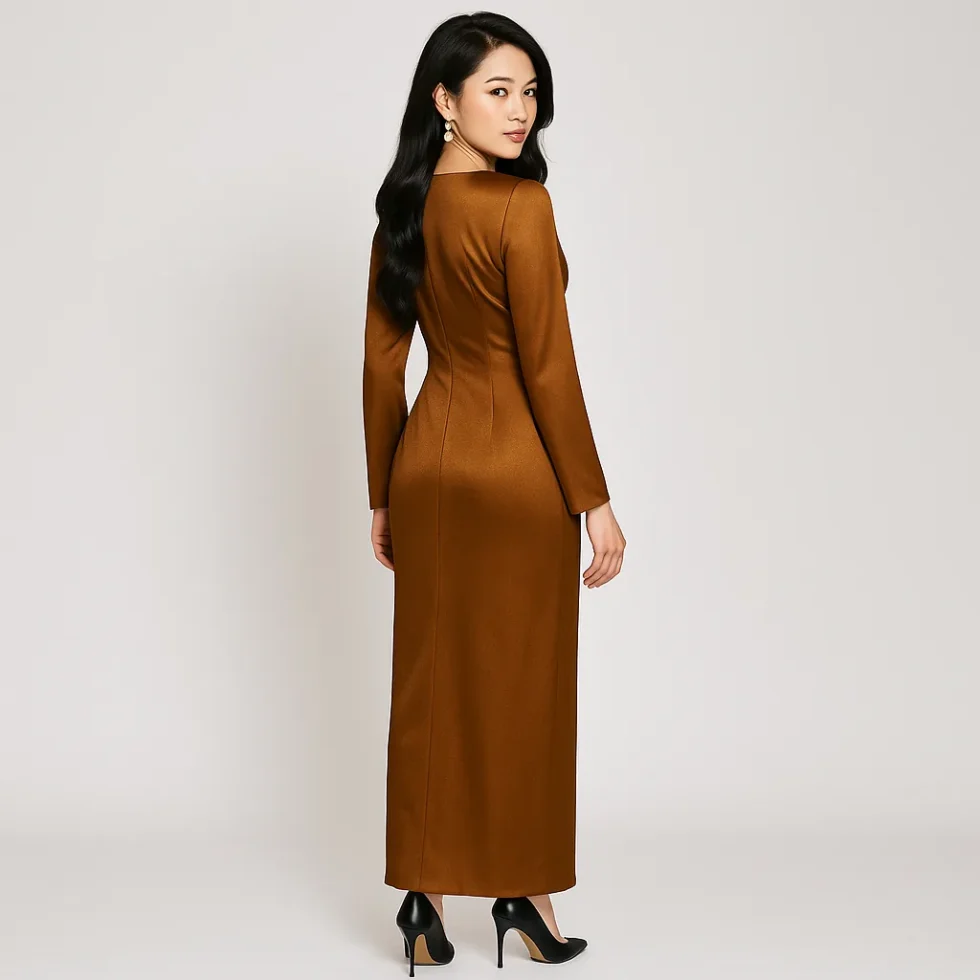 Váy dạ hội satin dài chấm đất với chi tiết hoa hồng ở eo. Một lựa chọn vượt thời gian cho đám cưới, dạ tiệc và các buổi tiệc trang trọng.